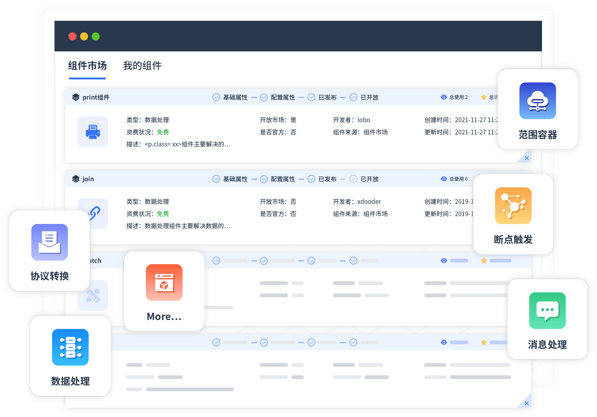 针对集成场景,,EBPAY提供组件市场,,例如协议转换、、、消息处理、、文件操作等。。除平台提供的组件外,,客户可以自定义所需组件。。。。