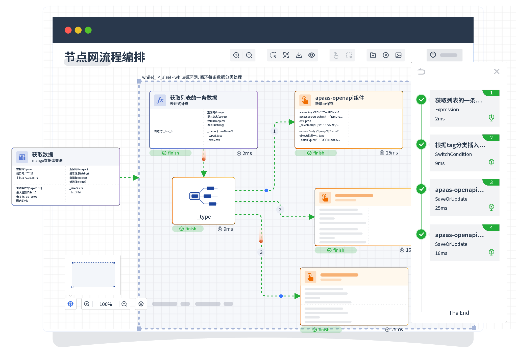 针对集成场景,,,,组件定义后支持进行流程编制,,不同于传统代码方式,,,通过图形化展示,,,支持在线调试、、、、日志查看和运行回放。。。