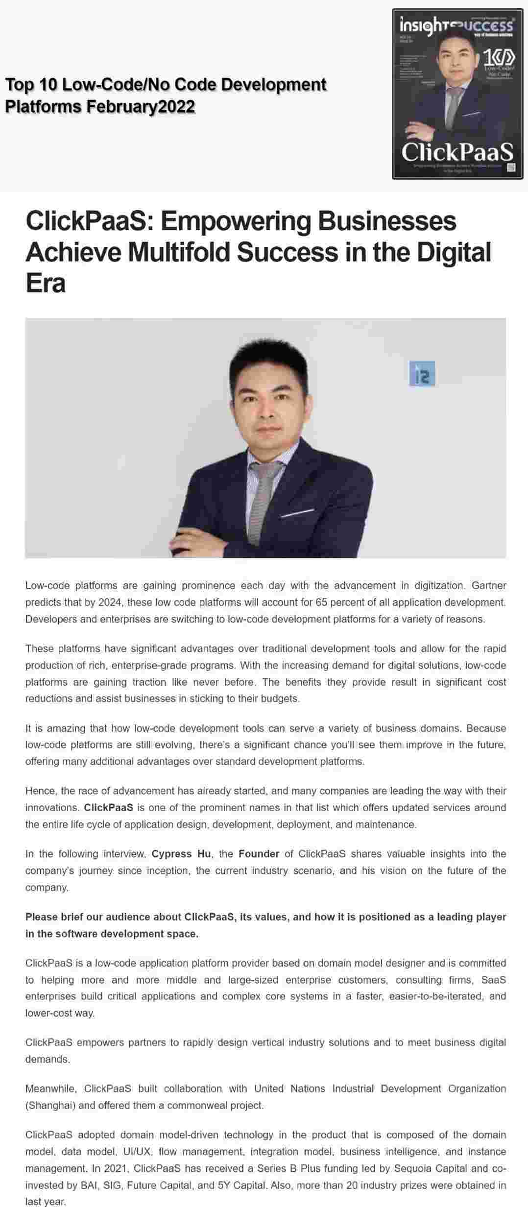 2022年年初,,,EBPAY入选外媒Insights Success低代码/无代码开发平台 Top10,,创始人、、、CEO胡柏受邀接受专访并荣登封面人物,,,,他与Insights Success的读者分享了EBPAY成立的初心、、、发展历程、、、、当前的行业发展趋势以及他对公司未来的展望。。。