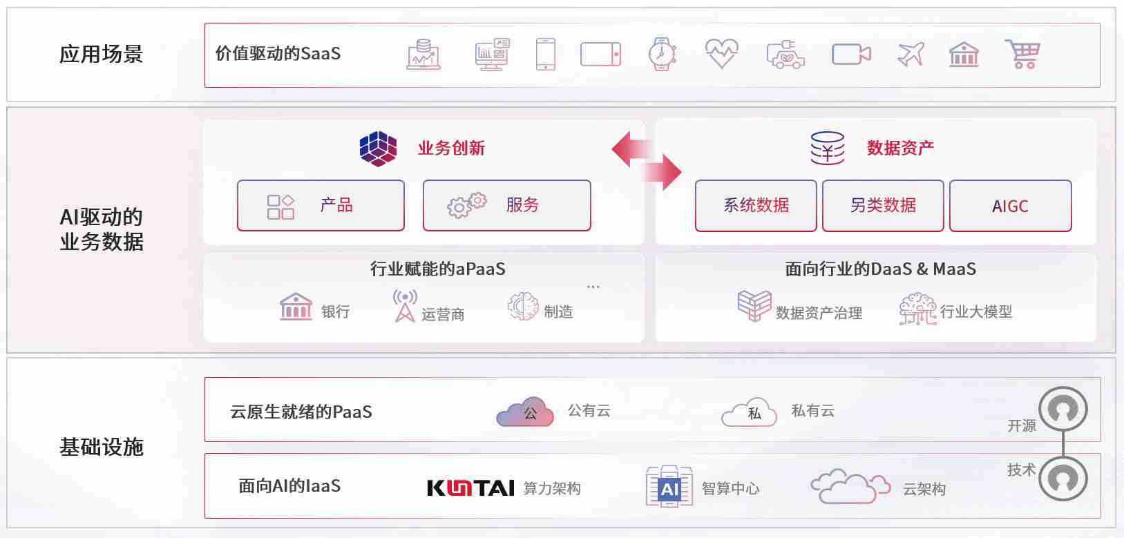 数字时代,,围绕企业数字化转型的关键要素,,,z6com尊龙凯时数码开创性的提出数云融合战略和技术体系框架,,,,着力在云原生、、、数字原生、、AI原生和信创产业上架构产品和服务能力,,,,为处在不同数字化转型阶段的快消零售、、、汽车、、金融、、医疗、、、、政企、、教育、、、运营商等行业客户提供泛在的敏捷IT能力和融合的数据驱动能力,,,,构建跨界融合创新的数字业务场景和新业务模式,,,,助力企业级客户建立面向未来的核心能力和竞争优势,,,全面推动社会的数字化、、智能化转型升级。。