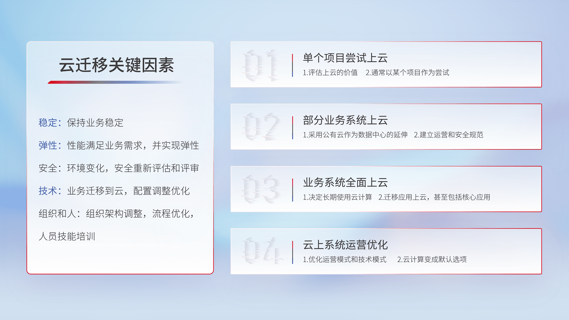 结合实际业务,,,,从规划设计、、云平台选型、、、云原生改造、、、、数据迁移、、集成交付,,,,迁移全过程为客户识别最佳上云路径,,,,做好风险识别管理,,,设计网络架构、、、身份权限、、、安全审计合规、、、操作审计、、、日志审计、、、监控告警策略、、、、多站点容灾设计等,,,,对云上基础设施进行整体规划,,,,提升IT治理水平,,,,以满足弹性、、、高可用、、、、高性能的需求。。。。