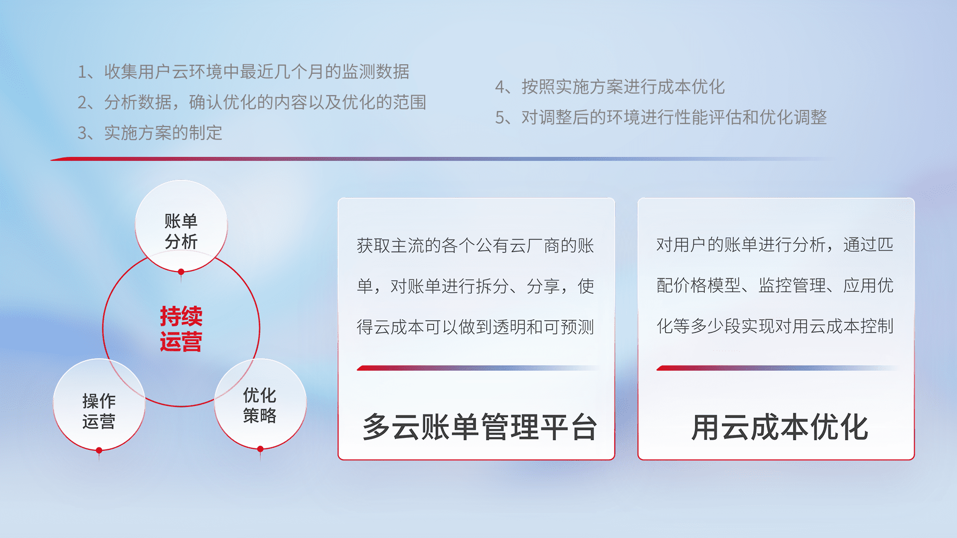 通过灵活运用多种自动化迁移工具,,帮助企业用户实现业务和数据高效 、、、稳定的上云迁移和云上迁移,,,,采用自研多云纳管平台,,以中立管理模式,,解决多组织、、多云、、、、多运维厂商的复杂关系的管理,,,保证多云平台资源配置的一致性,,,实时掌控云资源运行数据,,运用智能化工具分析云资源多云平台的管理服务,,透明化管理成本支出,,用云成本可预测、、、用云费用可优化、、、、云资源配额有据可依。。。