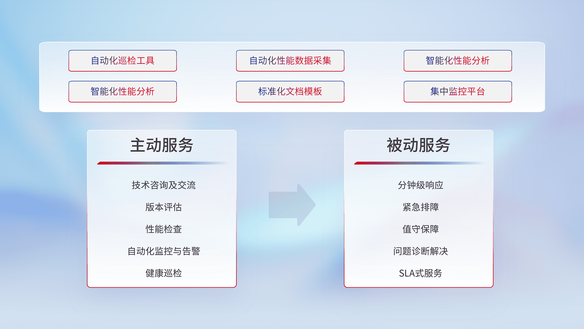 智能化工具和标准化文档,,,保障服务质量,,,,提供主动服务(包含技术咨询、、版本评估、、、、性能检查、、、、自动化监控与告警、、健康巡检)和被动服务包含(分钟级响应、、、、紧急排障、、、值守保障、、、问题诊断解决、、、SLA服务)。。。。